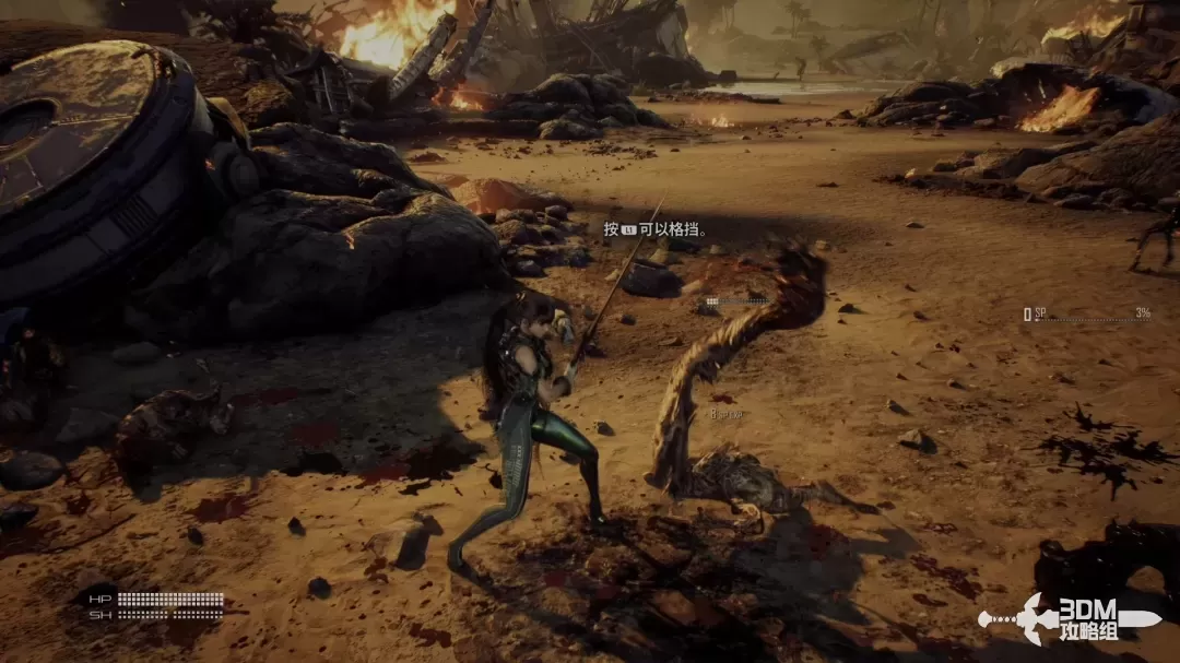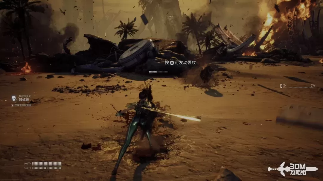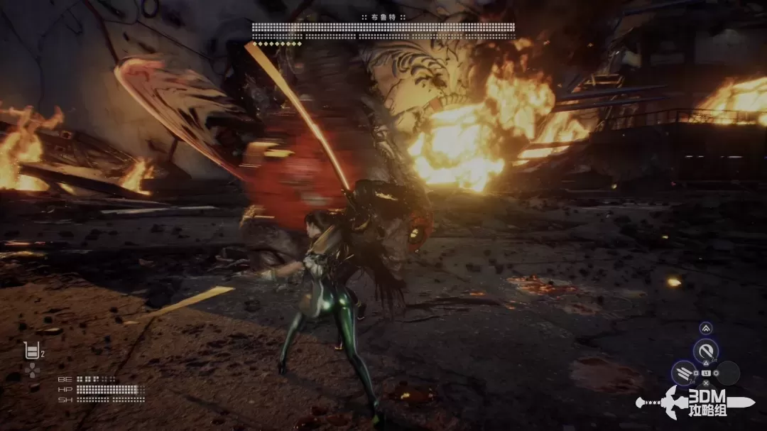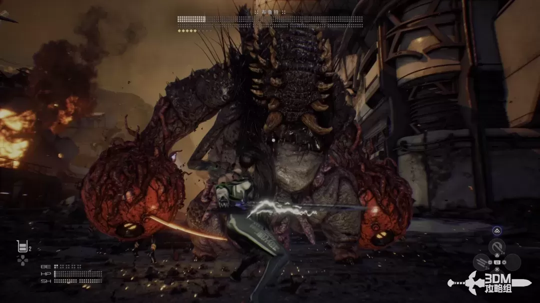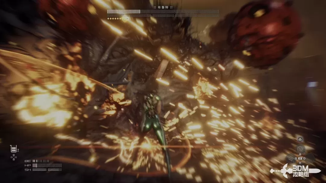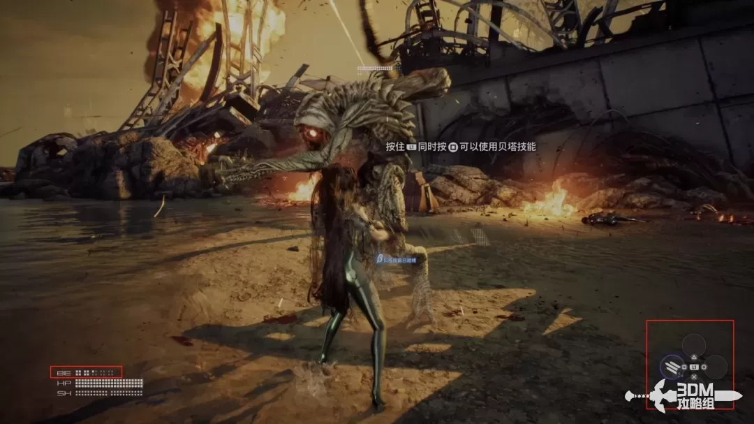 然后我们可以使用贝塔技能进行攻击,按下L1+方块就可以使用,消耗左下角的BE(贝塔能量),进行攻击或者完美格挡都将获得能量。