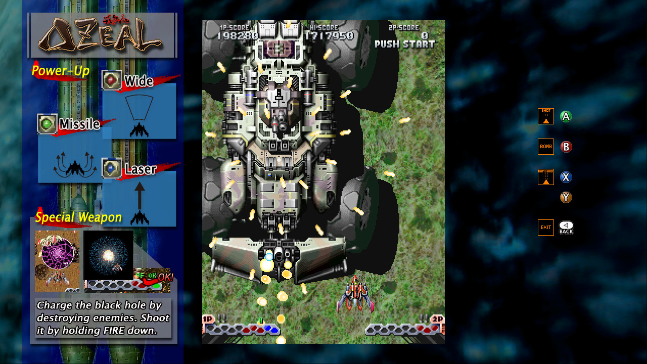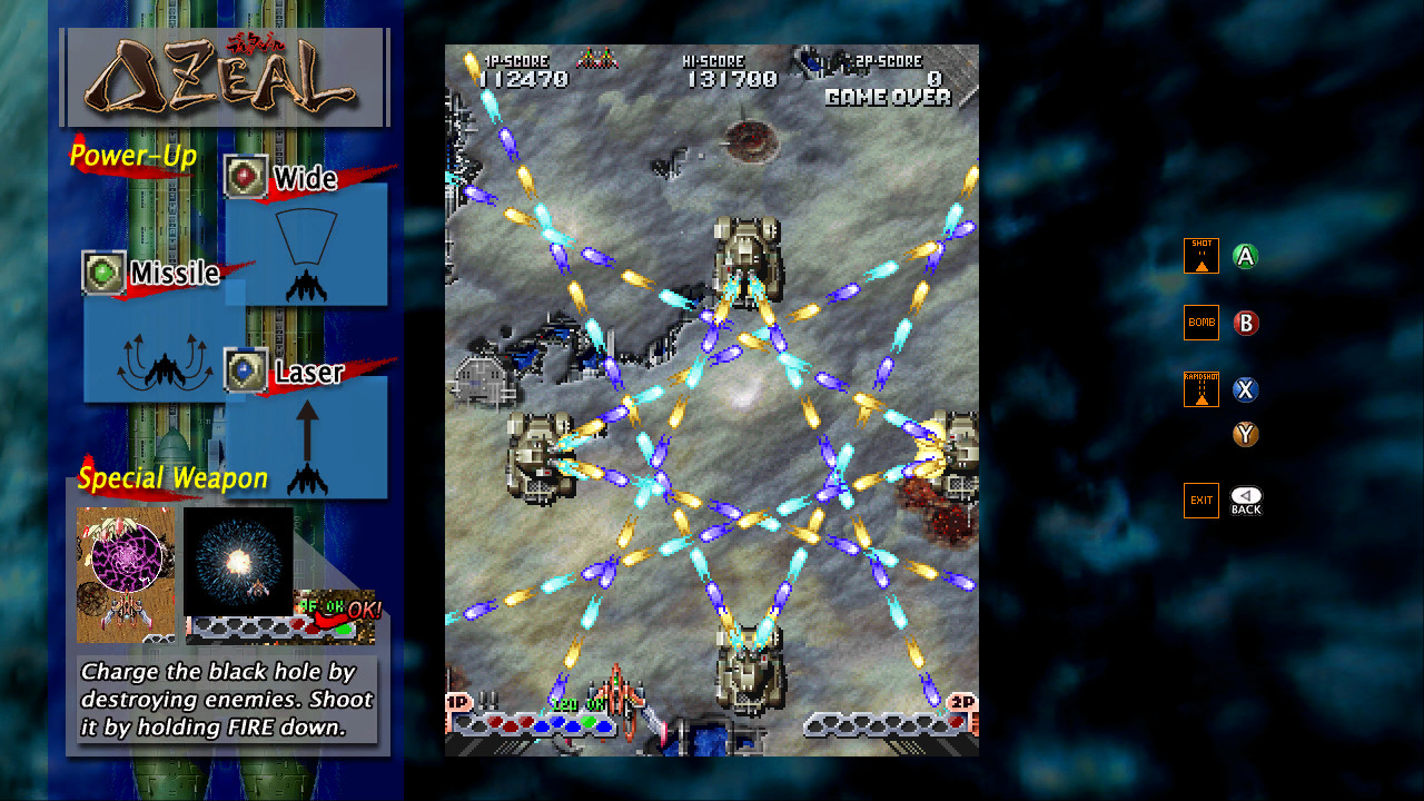 “只要射击和炸弹便足矣的王道射击”,这是一款于2002年在电玩中心登场的竖屏射击游戏。武器分为可进行广范围攻击的扇形弹、具贯穿力的激光,以及可自动追踪敌人的导弹,是可以切换运用3种威力强化武器的王道射击游戏,共有9个关卡。